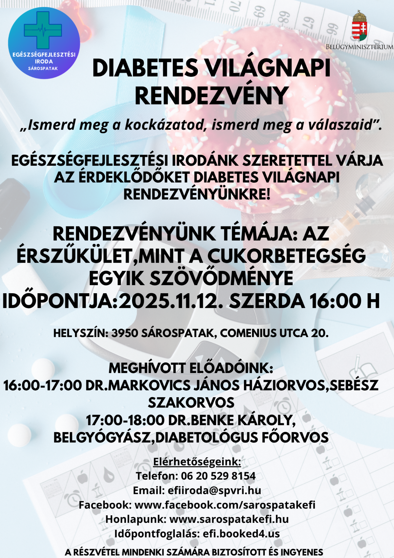 Ebből az apropóból 2025.11.12-én interaktív előadásokkal várjuk a járás cukorbetegeit, illetve a téma iránt érdeklődőket.
