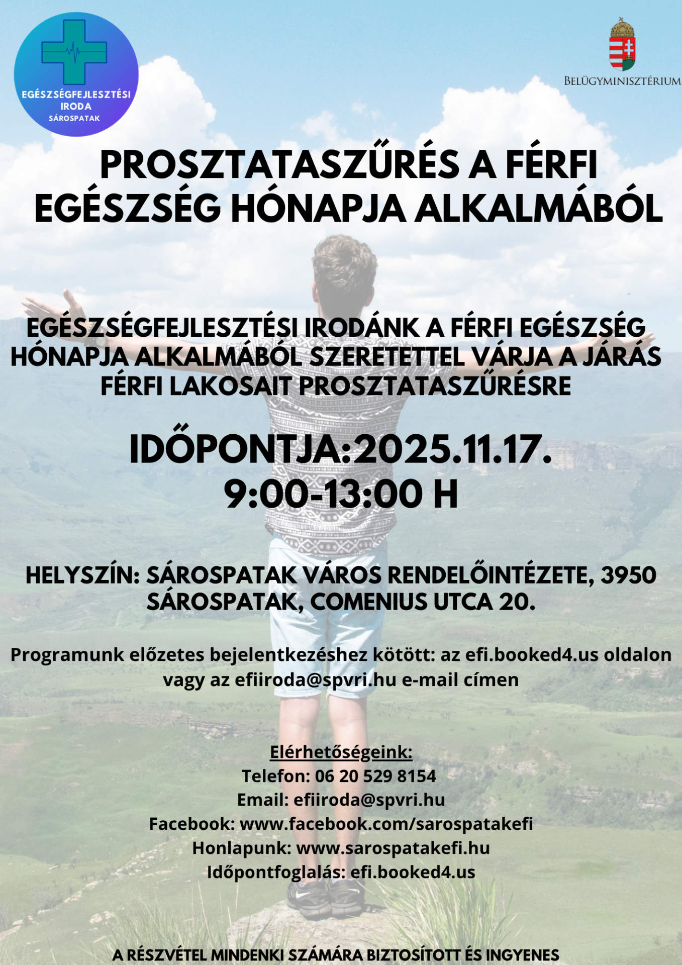 A kezdeményezéshez csatlakozva Irodánk prosztataszűrésre várja járás férfi lakosait 2025.11.17-én hétfőn 9:00-13:00 h között.Helyszín:Sárospatak város rendelőintézete.