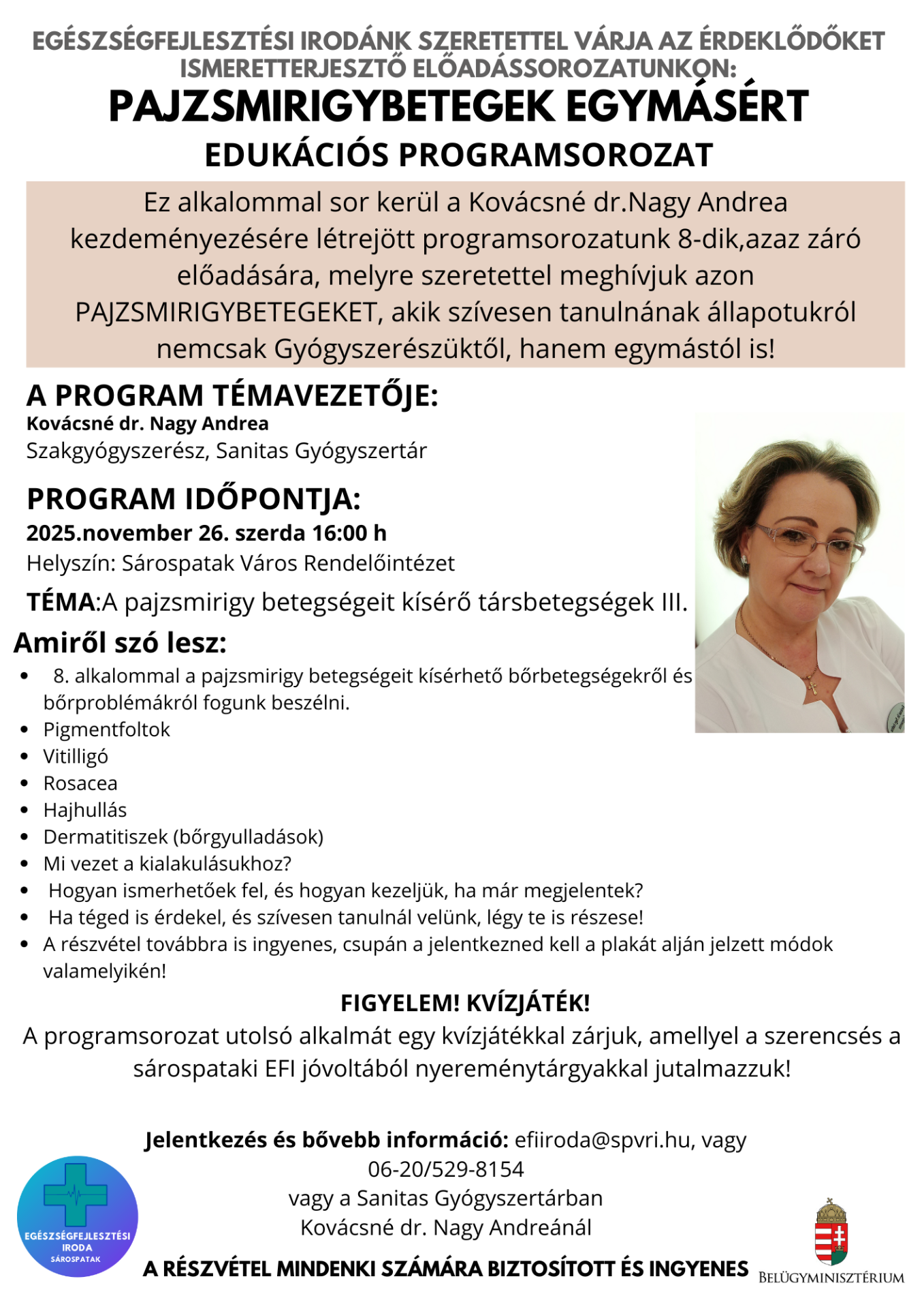 Egészségfejlesztési Irodánkban a járás pajzsmirigy betegei részére kínálunk hasznos edukációs programsorozatot, melynek célja az információnyújtás , illetve az érintettek közötti tapasztalatcsere. Programsorozatunk szakmai kivitelezője és megálmodója Kovácsné dr. Nagy Andrea, szakgyógyszerész.