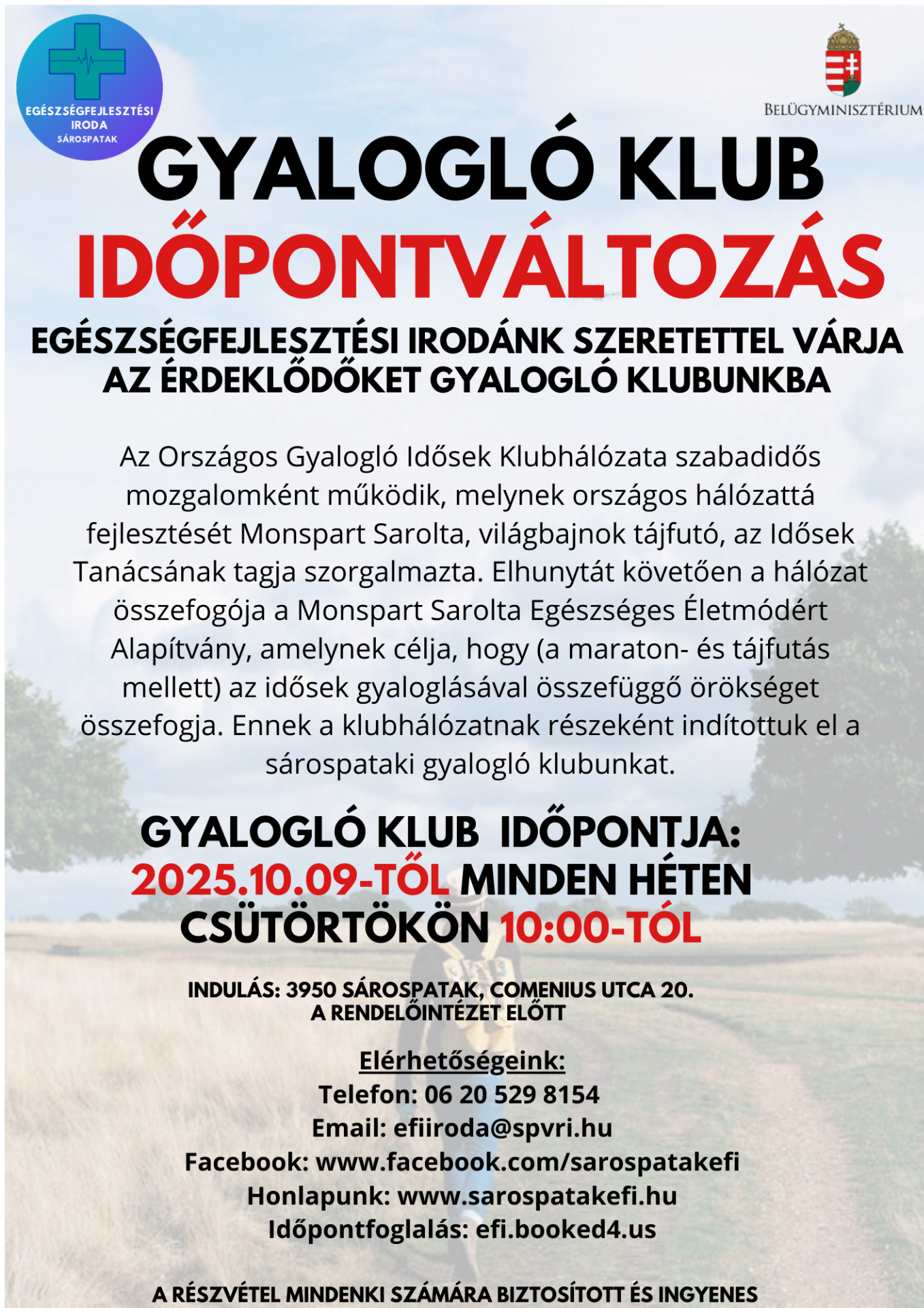 2025.10.09-től gyalogló klubunk kezdő időpontja az őszi időszaktól 9:00 óráról 10:00 órára változik.