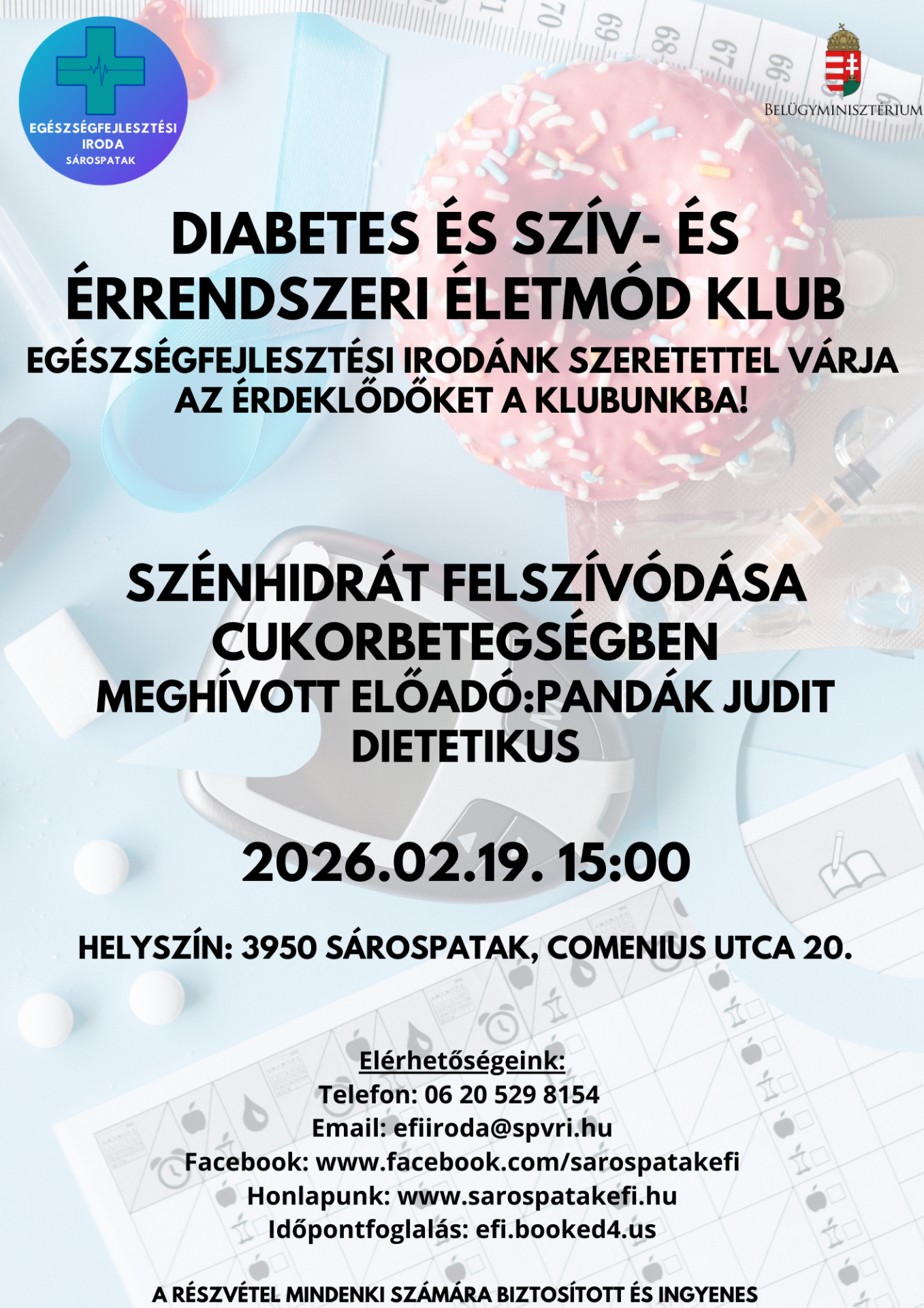 Sok szeretettel várunk minden diabetes betegségben érintett járási lakost, továbbá hozzátartozókat,illetve a téma iránt érdeklődőket február havi Diabetes-és szív-és érrendszeri életmód klubfoglalkozásunkra.