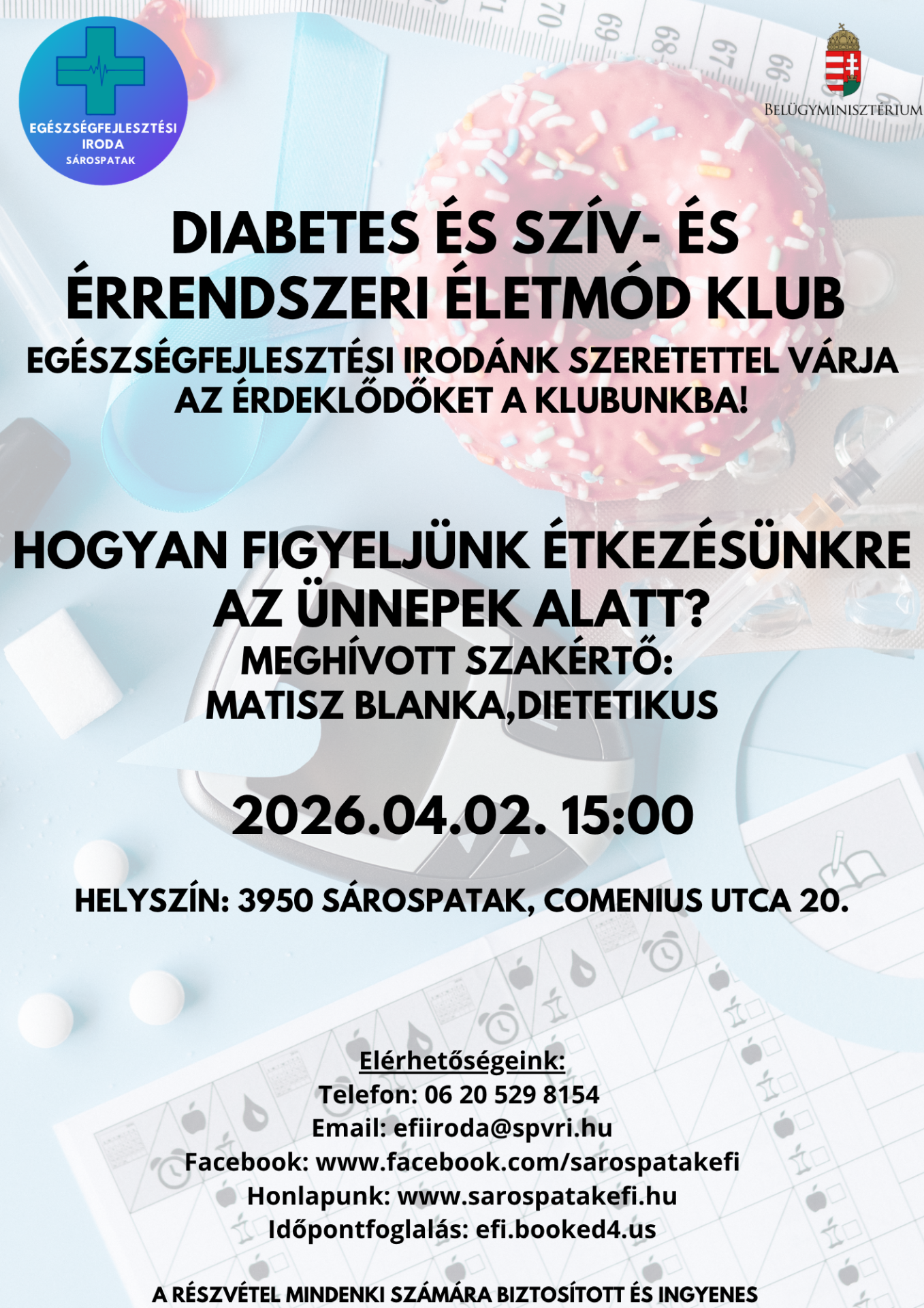 Egészségfejlesztési Irodánk minden hónapban megrendezésre kerülő Diabetes és szív-és érrendszeri életmód klubja márciusban is sok szeretettel várja az érdeklődőket!